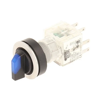 Club selector switch in stainless steel, blue backlit toggle with 3 positions left latching and right spring, at 9, 12 and 13 with spring return Installation opening diameter of 22,3 mm and flat front frame height of 2 mm Beleuchteter tast contact Dealer with 1 opener and 1 N/O Contact, designed for 250 V/6 A and a 24 V LED Connection Type: Single Flat Connector 2.8 mm x 0.8 mm IP protection rating: IP 65