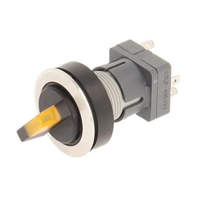 Club Selection Switch in stainless steel, yellow illuminated Toggle, with 2 rastenden, at 11 and 13 Installation opening diameter of 22,3 mm and flat front frame height of 2 mm Lighted tast contact transmitter with 1 Changer, 48 V/120mA and a 24 V LED Connection Type: Single Flat Connector 2.8 mm x 0.8 mm IP protection rating: IP 65