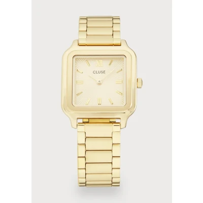 Bring cool design to your wrists with this stylish watch from Cluse. A beautiful classic, this stainless-steel watch features a square gold dial with a sunray pattern, with baton time markers, and a 3-link metal bracelet. Perfect for everyday wear, try stacking with bracelets for an even more elegant finish. Stainless steel Gold toned Square gold sunray dial Case diameter: 28mm 3-link metal bracelet strap