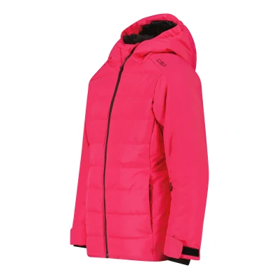 CMP 35W0315 insulated ski jacket for kids. A practical, weather-resistant jacket designed for winter slopes and snow play, offering a reliable balance of protection and comfort for young skiers. Constructed in Climaprotect fabric, the jacket combines a 10,000 mmH2O waterproof rating with 10,000 g/m²/24h breathability. That level of waterproofing and breathability is suitable for moderate mountain conditions, keeping moisture out while allowing body vapour to escape during activity. Insulation, lining and shell are 100% polyester, with Feel Warm Flat padding that provides consistent warmth across the garment without excessive bulk. The regular fit leaves room for a mid layer and unrestricted movement during skiing or play. Practical details include a fixed hood, an adjustable hem to seal out draughts, and adjustable cuffs with a stretch inner cuff for a secure fit under gloves. A dedicated ski pass pocket provides quick access at lift gates. The jacket focuses on functionality and durability. It is straightforward to layer, easy to adjust on the hill, and engineered to meet the typical demands of junior skiers and snow activities.