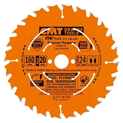 Diameter 160mm - Kerf thickness 1,8mm - Bore diameter 20 (+16)mm - Number of teeth: 24 APPLICATION: for rip and crosscuts at high-speed rotation. The blade considerably reduces material waste thanks to the thin-kerf design. Particularly suitable for valuable wood MACHINES: miter saws, table saws, portable and cordless saws MATERIAL: soft and hardwood, plywood, Manufacturer: CMT