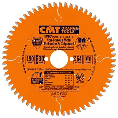 Blade itk plus ideal for work of particular heaviness, excellent on thin wall extrusions, good on thicker extrusions Machines: radial saw, miter saws, special and table saws Materials: aluminum, brass, copper, pvc, non-ferrous materials and composite flooring D=190 mm, hole=30 (+20+16), number of cutting edges, cutting angle=-6° neg, Manufacturer: CMT
