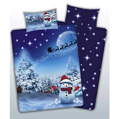 King size Christmas Snowman Duvet & Pillowcase Bed Set Winter Wonderland festive Snowman in its best colors blue, red and white on a cotton rich fabric Material : 42% Cotton , 48% Polyester Easy Care, Durable Fabric and Machine Washable King size bed duvet cover set 230 x 220 cm plus 2 pillowcase 50 x 75 cm