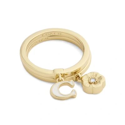 ArgentoBring pretty details to your stacks with these rings from Coach. Crafted in a gold tone, this ring set features a charm of the iconic ‘C’ logo adorned with white enamel and a tea rose dangle charm. A beautiful choice for any occasion, these rings would make a beautiful gift. Gold toned ‘C’ logo charm White enamel details Tea rose charm Set of 2 rings Size: 54