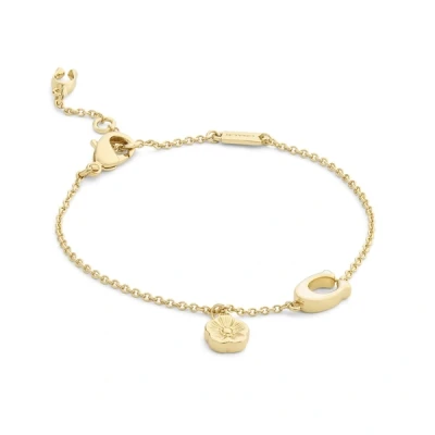 ArgentoBring pretty details to your stacks with this bracelet from Coach. Crafted in a gold tone, this bracelet features the iconic ‘C’ logo adorned with white enamel and a tea rose dangle charm. A beautiful choice for any occasion, this bracelet would make a beautiful gift. Gold toned ‘C’ logo motif White enamel details Tea rose charm Adjustable bracelet Length: 16.5cm + 2.5cm