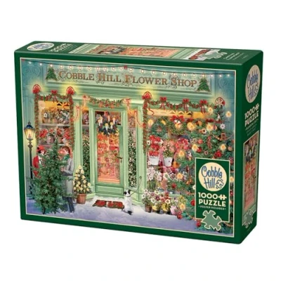 CHRISTMAS FLOWER SHOP: By Barbara Behr is a 1000 piece vintage themed puzzle highlighting the Cobble Hill Flower Shop during the Christmas season. A faithful dog sits in the snow staring through the shop door at the beautiful flowers while his well dressed owners pick out their Christmas tree. The street lantern and Christmas lights bring a warm glow to the centre of the puzzle, while the outer edges and trees will have a big more shadow COBBLE HILL PUZZLES: As well as having such wonderful images, Cobble Hill puzzles are all eco-friendly, the cardboard is made from 100% recycled material and the inks used are all vegetable based RANDOM-CUT PIECES: This piece design means each puzzle piece looks different - A fun challenge HIGH-QUALITY MATERIAL: The glare-reducing linen paper and crisp image make it a perfect piece to frame. USER FRIENDLY: All puzzles are manufactured using thick blue board which gives every puzzle a deluxe sumptuous feel NO INSTRUCTIONS REQUIRED: Simply use the box cover or convenient linen print poster included. Finished size is 26.625" x 19.25”, Manufacturer: Cobble Hill Puzzle Company