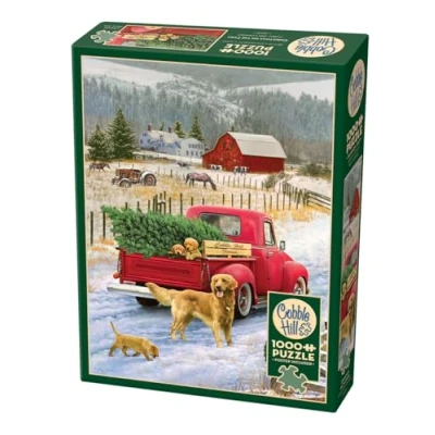 CHRISTMAS ON THE FARM 1000 PIECE PUZZLE: The puppies hitch a ride in the vintage truck to make sure Christmas on the Farm includes a fresh cut tree. A lovely 1000 piece mountain snow scene to enjoy during the winter COBBLE HILL PUZZLES: As well as having such wonderful images, Cobble Hill puzzles are all eco-friendly, the cardboard is made from 100% recycled material and the inks used are all vegetable based RANDOM-CUT PIECES: This piece design means each puzzle piece looks different - A fun challenge HIGH-QUALITY MATERIAL: The glare-reducing linen paper and crisp image make it a perfect piece to frame NO INSTRUCTIONS REQUIRED: Simply use the box cover or convenient linen print poster included. Finished size is 26.625" x 19.25”, Manufacturer: Cheatwell Games