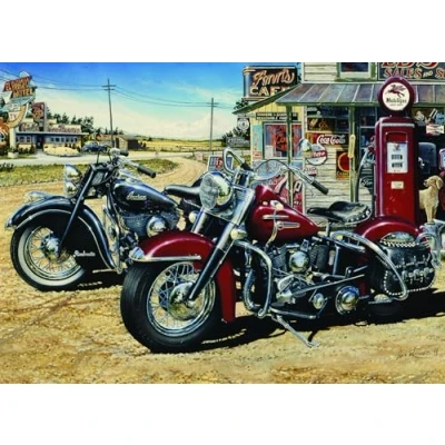 TWO FOR THE ROAD 1000 PIECE PUZZLE: The wind blows through your hair and the asphalt radiates the heat of the sun. The only sounds are the roar of the engines and the call of adventure, and the endless blue sky is dragging you onwards. A dirt road, a small gas station, vintage signs and waves of nostalgia. This 1000 piece puzzle might be the motorcycle trip you've always dreamed of EARTH FRIENDLY: All cardboard used in this 1000 piece jigsaw puzzle is made from 100% recycled material. Plus all of the ink used in creating such crisp and clear images is vegetable based RANDOM-CUT PIECES: Random cut puzzles are the signature style of a Cobble Hill puzzle. Quirky piece shapes make puzzle time more adventurous while the linen print texture is calming to your fingertips HIGH-QUALITY MATERIAL: The glare-reducing linen paper and crisp image make it a perfect piece to frame, the durable high-quality blue board makes snapping your piece into place possible time and time again NO INSTRUCTIONS REQUIRED: Simply use the box cover or the poster included. Finished size is 67.6CM x 48.9CM, Manufacturer: Cobble Hill Puzzle Company