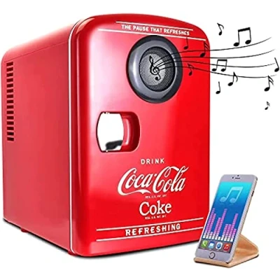 Coca Cola Mini Fridges For Bedrooms 4L Quiet Small 6 Can Table Top Fridge Portable Retro Cooler Warmer with Built In Bluetooth Wireless Speaker Drinks Food Coke Kids Skincare Office Home Desk Red