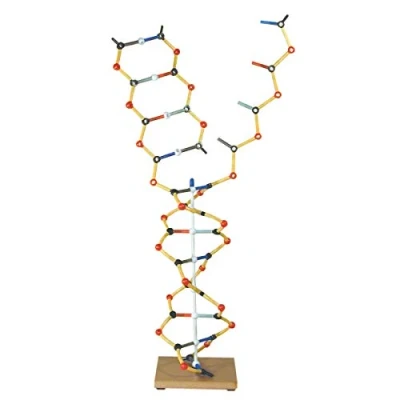 This small DNA-RNA model shows the double helix and how the molecules split at the centre of the base pairs 30 colored tubes (Guanine red Cytosine green Thymine blue Adenine gray Uracil white) 12 white two prong centre which represents the hydrogen bond between the base pairs 28 black trigonal atom centres which represent sugar 25 red two prong atom centres which represent phosphate groups Number of items: 1 Included components: DNA - RNA Model