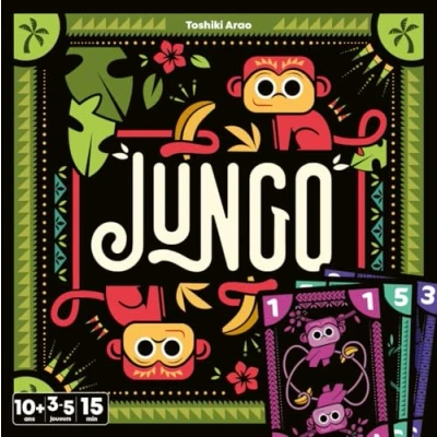 Jungo is a card game where the goal is to be the first player to get rid of all your cards. Players can't rearrange their hands, and must play cards in sets of the same value that are adjacent in their hand. Players can either beat an opponent's play, or pass and draw a card. A special "jungo" rule allows players to play a dual-value card immediately to beat a combination. When you beat a combination of cards, choose whether to strengthen your hand for future placces, OR discard it and get closer to victory., Manufacturer: Cocktail Games