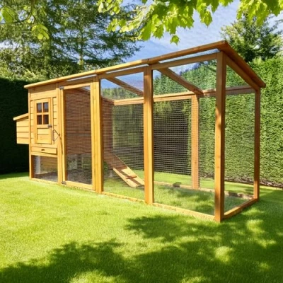 Approx. dimensions (including nest box and roof overhangs): 250cm (L) x 76cm (W) x 103cm (H) Metal-lined pull-out tray for quick and easy cleaning Please note: THIS IS NOT A WALK IN COOP Opening roof panels for easy access and cleaning Includes nest box and perches – suitable for 3–4 birds, depending on breed and size