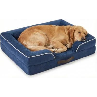 DUAL-LAYERED DESIGN: Our dual-layer foam base for perfectly to your pet's body for maximum comfort. Featuring one layer of premium memory foam and the other of orthopedic foam, designed to cater to diverse sleeping preferences. A comfortable dog bed for older dogs with anxiety and arthritis. The non-slip bottom keeps the dog bed in place, giving your dog more security. ORTHOPEDIC SUPPORT: The sofa dog bed with U-shaped design to provide optimal support, comfort and security for dogs, 3-sided foam-filled bolster that provides exceptional support for pets who love resting their heads, It relieves muscle tension and promotes restful sleep. WATERPROOF COVER: A waterproof film is positioned between the fleece surface and the bottom fabric, ensuring the dog bed remains dry. However, the liner foam are not waterproof. CONVENIENT TRANSPORT & STORAGE: We understand the importance of convenience, which is why this pet couch is equipped with a faux leather handle attached to the front. This allows for easy transportation or storage, ensuring hassle-free mobility whenever you need it. DOG SOFA SIZE: Dog sofa with high-quality flannel material offers soothing comfort that even the most anxious dogs will find cozy and relaxing. Available in 3 sizes for medium size, large size, extra large dog breeds. Note: Please leave it for 24 hours once out of the bag and it will regain real shape and thickness.