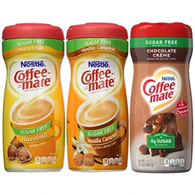 Coffee-mate Dairy Free Sugar Free Cream 3 Flavor Pack (1) Sugar Free Vanilla Candy 10.2 oz (1) 10.2 oz unsweetened creamy chocolate (1) 10.2 oz Sugar Free Hazelnut