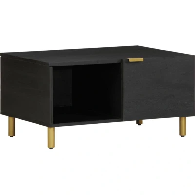 ManoManoGeneral description Relax and enjoy entertaining your family and friends around this stylish coffee table. With its modern design and practical features, it serves as a perfect centerpiece for your living room. Technical specifications Colour: Black Material: Engineered wood, solid mango wood, brass Overall dimensions: 80 x 50 x 40 cm (L x W x H) Feet height: 10 cm Assembly required: Yes Usage Provides ample storage space for magazines, books, DVDs, remote controls, and other small items. Sturdy tabletop ideal for placing drinks and other necessities within reach. Equipped with metal handles for easy access and a stylish industrial touch. Other information