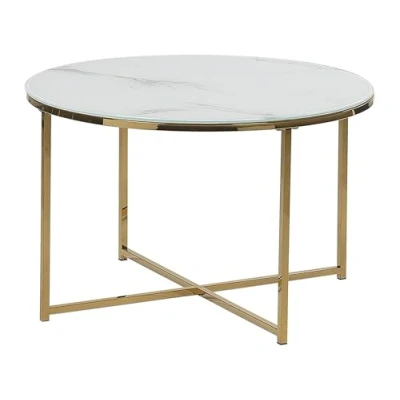 General description Decorated with this shiny coffee table, every living area set-up becomes more glamorous. Featuring a round tempered glass top with a marble effect and sturdy stainless steel legs in shiny gold, it not only looks luxurious but also lasts for many years. Place it in front of the sofa or next to your favorite armchair to upgrade your room's look. Technical specifications Product Type: Coffee Table Style: Modern General Color: White, Gold Main Material: Tempered Glass Additional Material: Stainless Steel Leg Material: Metal Top Material: Glass Shape: Round Finish: Polished Dimensions: Width: 70 cm, Length: 70 cm, Height: 45 cm Weight: 9 kg Weight Capacity: 15 kg Installation Full assembly required Estimated assembly time: 20-40 minutes Usage Clean tempered glass with a mild cleaner or glass conditioner using a soft cloth Wipe dry immediately after cleaning To avoid scratches, do not use a cream cleaner For stainless steel, clean with a mild cleaner and soft cloth, wipe