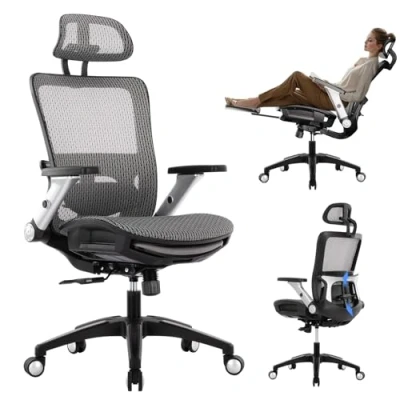 COLAMY Ergonomic Mesh Office Chair with Footrest High Back Computer Desk Headrest, 4D Flip up Armrests, Adjustable Tilt Lock, and Lumbar Support for Ultimate Comfort, Black (Grey)