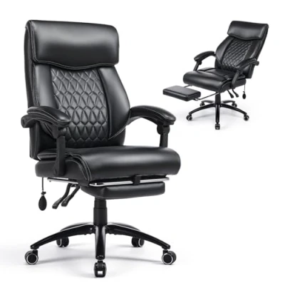 【UPGRADED ADJUSTABLE LUMBAR SUPPORT】 Built to support your body through long work hours, this ergonomic chair features an adjustable airbag lumbar support that inflates or deflates for customised comfort. The flip-up armrests save space and allow more flexible movement when needed. 【ROCKING, RECLINING & RETRACTABLE FOOTREST FUNCTION】 Switch easily between focused work and relaxation with the 117° rocking recline and extendable footrest. Pull out the lever to activate rocking mode, adjust tilt tension to suit your preference, and stretch out your legs for a quick rest break. 【PREMIUM PU LEATHER & PLUSH PADDING】 Crafted with high-quality PU leather that’s smooth, durable and easy to clean. The thick foam seat and backrest provide cloud-like comfort for long working hours. 【ERGONOMIC HEADREST & CURVED BACKREST】 The plush padded headrest supports your neck and shoulders, while the ergonomically curved backrest follows your spine’s natural shape to reduce pressure and improve posture. 【DURABLE METAL BASE & SMOOTH MOBILITY】 Supported by a strong metal base and silent rolling casters, this executive office chair ensures stability and smooth movement on various floors, holding up to 136kg.