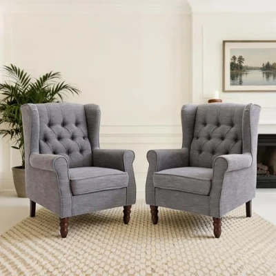 Accented by the tufted back and integrated arms completing its contemporary-traditional look. The back piece is soft and comfortable, with hand-tufting and buttons that will definitely stand out among the rest of your furniture This armchair has a high back, with some lumbar support to make this a great armchair for back support. The high-density & high-resilient thick padding seat keeps you comfortable as you read, watch television, or chat with guests 100% fabric upholstery is durable and looks fantastic, which helps reduce wear and prolong their life. And the linen-look covering adds a touch of texture to the couch chair To increase the chair’s strength, this club chair uses a solid hardwood frame that is durable enough to handle some regular sitting, which will hold up to 300 LBS. The wooden round gourd front legs and the curved back legs are solid rubberwood as well, with a brown color that accents the rest of this armchair's stylish appearance It is stylish, with a mid-century look combined with a few modern upgrades that allow it to fit into any room of your home, whether bedroom, living room, study, balcony, reading room, office, or dormitory. This armchair would also stand out in the office, lounge, reading room, bookstore, and café