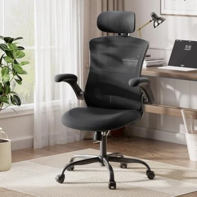 👍【MULTI-FUNCTIONAL OFFICE CHAIR】Experience the next level of comfort with our high back ergonomic office chair, which includes an adjustable headrest, customizable lumbar support, flip-up armrests, and swivel rolling casters. The adjustable height and rocking back and forth make you can find the perfect ergonomic position in working or relaxing. Whether working, studying, or gaming, this ergonomic chair enhances your comfort and productivity. 👍【ERGONOMIC OFFICE CHAIR WITH ADJUSTABLE LUMBAR SUPPORT】Our ergonomic chair features a fully adjustable lumbar support system that provides targeted back relief. The curved backrest aligns your spine correctly, reducing lower back strain and allowing you to adjust the lumbar support height to your preference. This customization provides maximum comfort and support tailored to your individual needs. 👍【BREATHABLE MESH OFFICE CHAIR】Designed with a breathable mesh fabric, this mesh office chair promotes excellent airflow to keep you cool and comfortable throughout the day. The durable mesh has been rigorously tested to endure up to 120,000 cycles, offering long-lasting use. Additionally, the waterfall seat design helps alleviate pressure on your legs, enhancing overall comfort. 👍【FLEXIBLE SWIVEL ROLLING CHAIR】Featuring solid, smooth-rolling casters, this mesh office chair moves effortlessly over various floor surfaces, including carpet and hardwood. The wheels are designed to enhance mobility and reduce noise, allowing you to move around your workspace quietly and efficiently. 👍【SOLID CONSTRUCTION】Made for last! This office chair features a heavy-duty nylon base and smooth-rolling casters for excellent stability and mobility. BIFMA certification, more reliable and sturdy, maximum capacity up to 125 KG (275 LBs). Easy to assemble, the executive chair equipped with detailed instructions, anyone can complete the assembly in 10-20 minutes.