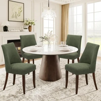 COLAMY Upholstered Dining Chairs Set of 4, Linen Fabric Parsons Room with Curved Backrest, Solid Rubber Wood Legs, 13cm Thick Padded Seat, Kitchen & Living Chairs,Green