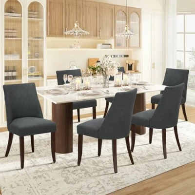 COLAMY Upholstered Dining Chairs Set of 6, Linen Fabric Parsons Room with Curved Backrest, Solid Rubber Wood Legs, 13cm Thick Padded Seat, Kitchen & Living Chairs,Dark Grey