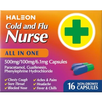 EI: Haleon Cold and Flu Nurse All in One Capsules, contain Paracetamol; always read the label EFFECTIVE: Nothing Stronger for cold and flu relief FOR COLD AND FLU: Relieves chest cough, sore throat, blocked nose, headache, aches and pains, fever and chills HOW TO TAKE THIS COLD MEDICINE: For adults aged 16 and over only : take 2 capsules every 4 hours as required; do not take more than 4 doses in any 24 hour period QUANTITY LIMIT: You can only buy 2 products containing paracetamol or aspirin per purchase