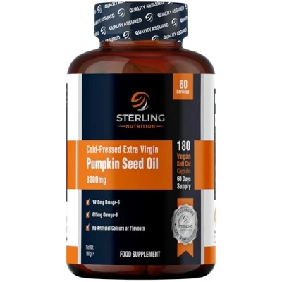 WHY PUMPKIN SEED OIL: Each daily serving of our Cold-Pressed Extra Virgin Pumpkin Seed Oil Soft Gel Capsules contains 3000mg of high strength support, as well as delivering 1410mg of Omega-6 and 615mg of Omega-9, derived naturally from premium pumpkin seeds. NUTRIENT RICH SUPPLEMENT: A nutrient-rich supplement packed with essential fatty acids and antioxidants to support bladder, urinary tract and prostate health, promote hair growth, heart and skin health, enhancing overall wellness. COLD PRESSED: Using gentle cold pressed methods, the oil retains its full nutrient profile and rich, dark colour, ensuring its extra virgin quality. Unprocessed and pure, this oil offers a natural way to support your wellbeing. Lower-grade oils are often pale yellow in colour, low in density, heavily processed, and do not retain all their key nutrients. EASY SWALLOW & VEGAN: The pack contains 180 capsules for a 2 month (3 per day) supply of easy swallow Smart Release Technology softgels for optimal absorption. Our supplement is gluten and GMO free, contains no artificial colours or flavours, and is vegan friendly. TRUST IN SCIENCE: Sterling Nutrition offers high quality, science-backed supplements. Our products are tested by chemists and made to global standards, ensuring reliability and trust for adult nutrition.