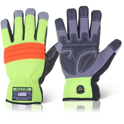 FeaturesRubber Bumpers knuckle protectionHi-Viz back hand finger tipsPU serino grip palm patchingTerry towel thumb backStitched vinyl TPR puller on front cuffEasy slip fit styleWater barrier insideApplicationsMulti-PurposeCommercial ConstructionsGoods InstallationsCold WeatherSafety Law EnforcementCold StorageEN388:2003 Level 3 - Abrasion Level 2 - Cut Resistance Level 4 - Tear Resistance Level 2 - PunctureEN511 1 4 1