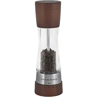 Contemporary style; durable acrylic and forest wood Clear body to easily see fill levels - comes filled 6 settings for fine to coarse pepper grinds Easy fill, pull stainless steel cap All Cole and Mason salt and pepper mills are covered by Cole and Mason's mechanism guarantee; should your mill not meet the high standards and expectations of Cole and Mason products, Cole and Mason will be happy to replace your mill for an alternative of equivalent value; accidental breakage, poor care and damage from misuse are not covered