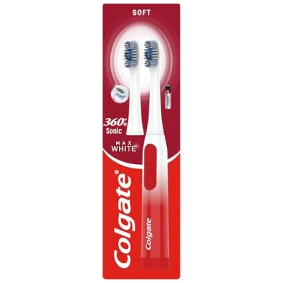 Take care of your bright, white smile with the Colgate 360 Sonic Max White Battery Powered Toothbrush This battery toothbrush also cleans in 4 ways for a bright, white, healthy smile This soft battery toothbrush removes more stains than a regular flat trim manual toothbrush and has spiral bristles to polish the surface of your teeth The Colgate battery toothbrush has slim tip bristles to clean between teeth, regular bristles for flat surfaces, a rubber polisher to help remove surface stains and a tongue and cheek cleaner to remove bad breath bacteria The battery operated toothbrush comes with a replaceable head and an AA battery, so it’s ready to use as soon as you get it