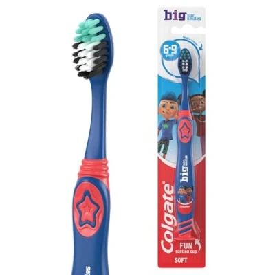 CARE FOR BIG KIDS’ TEETH: Look after big kids’ smiles with the Colgate Kids’ Toothbrush that’s made for kids aged 6-9 years. MULTI-HEIGHT SOFT BRISTLES: Our kids’ toothbrush has been specially designed with extra multi-height bristles to clean big and small teeth and comes with a rounded tip to clean hard-to-reach back teeth. SOFT TONGUE CLEANER: Our kids' toothbrush comes with a soft tongue cleaner to remove bacteria and freshen breath TOOTHPASTE GUIDE: Comes with inner white coloured bristles to show you how much toothpaste to put on this kid’s toothbrush for the optimal protection and a suction cup that makes it easy and fun to store upright. OPTIMAL ORAL CARE: For the optimal oral care routine, use this kids’ toothbrush with Colgate Big Kids’ Smiles toothpaste that provides 24-hour sugar acid protection. COLOURS VARY: The toothbrush you receive may be a different colour from the one shown.