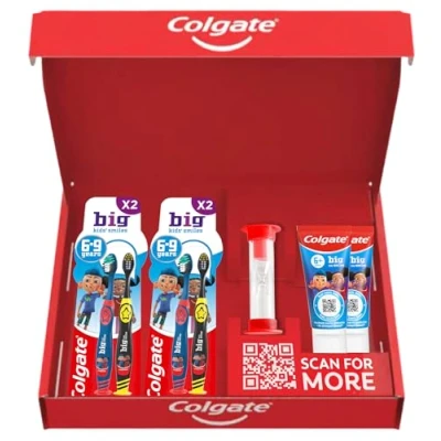 LOOK AFTER BIG SMILES: With 2x Colgate Big Kids' Smiles 6+ Years Toothpaste, 4x Colgate Kids Toothbrushes 6-9 Years and a 2 minute timer you can look after your little kid’s big smile! STRONGER ENAMEL: Our kids toothpaste 6-9 years provides maximum cavity protection for teeth and has been designed to make your child’s enamel 4X stronger*. *At 2 weeks mineral change compared to regular fluoride toothpaste. SUGAR ACID NEUTRALISER: Our children’s toothpaste contains a sugar acid neutraliser that disarms sugar acids in plaque before they cause damage that can lead to caries. COLOUR CHANGING TECHNOLOGY: With colour changing technology, our children’s toothpaste will turn blue after brushing for a while, making it fun for kids to clean their teeth and encourage them to brush for the recommended 2 minutes. MULTI-HEIGHT SOFT BRISTLES: Our kids’ toothbrush has been specially designed with extra multi-height bristles to clean big and small teeth and comes with a rounded tip to clean hard-to-reach back teeth. SOFT TONGUE CLEANER: Our kids' toothbrush comes with a soft tongue cleaner to remove bacteria and freshen breath. 2 MINUTE SAND CLOCK TIMER: With the 2 minute sand clock timer included in our kids toothpaste set, you can make brushing even more interactive and fun to encourage great brushing habits.
