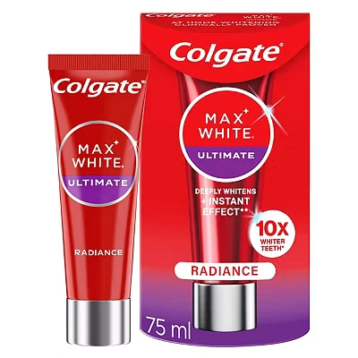 Colgate Max White Ultimate Radiance Toothpaste deeply whitens teeth up to 10X using active oxygen molecules and blue optic brighteners for instant brightness. It’s enamel-safe, non-abrasive, and helps prevent future stains with clinically proven technology.