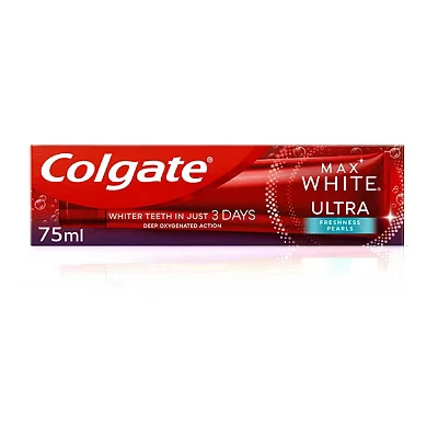 Colgate Max White Ultra Freshness Pearls Teeth Whitening Toothpaste 75ml delivers visibly whiter teeth in just 3 days with millions of active oxygen molecules for deep stain removal, while freshness pearls provide lasting flavor and cooling. Its zero-abrasive, enamel-safe formula is suitable for daily use.