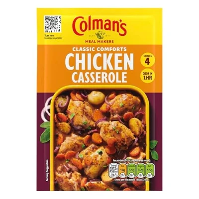 JoybuyColman's Chicken Casserole 40g is a meal maker blend for creating tasty chicken casseroles with herbs and spices; it serves 4, is quick to prepare, and contains wheat and barley. Just add chicken and vegetables for a delicious family dish.