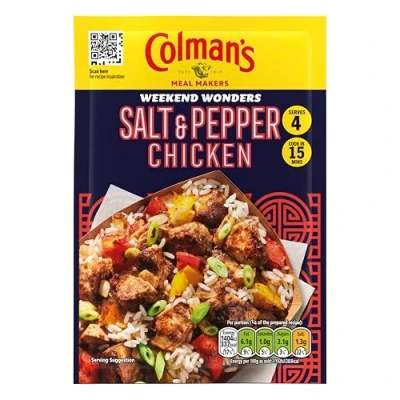 Whip up your own full-on-flavour version of your favourite takeaway with Colman’s Weekend Wonders Salt & Pepper Chicken Meal Maker recipe mix An irresistible seasoning mix with ginger, garlic and pepper that lets you enjoy a delicious Chinese-style chicken within minutes Our Salt & Pepper Chicken Meal Maker recipe mix contains no artificial colours or preservatives and comes in an easy-to-use, recyclable paper pack With this spice mix, you can make a tasty Chinese-inspired dish in just three simple steps For a meat-free take on this classic family meal, why not swap the chicken for diced tofu or plant-based chicken pieces? This Colman's meal maker recipe mix provides 4 servings so you always have a delicious meal at hand