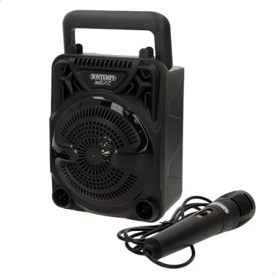 All-in-one speaker with microphone: compact design (11.5x10x18cm) with handle and RGB light effects, perfect for bringing music to any event Microphone Included: Optimal for karaoke, presentations or speeches, providing a complete experience Versatile connectivity: compatible with mobile devices, tablets and PCs, with playback options via wireless, aux cable, USB or microSD card (not included), plus built-in radio function TWS Stereo Sound - Option to connect another speaker and enjoy immersive stereo sound RECHARGEABLE BATTERY - With its rechargeable lithium battery via USB Type-C cable (included), you can enjoy hours of entertainment without interruptions