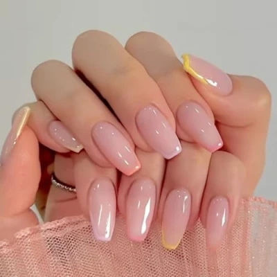 Colorful French Tip False Nails Coffin, SXVME Rainbow Press on Medium Short Ballerina Fake Full Cover Nude Acrylic Glossy Glue ons for Nail Art 24 Pcs