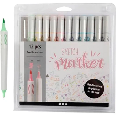 Unleash your creativity with our Sketch Marker Pack – 12 Colours. These high-quality, water-based markers are perfect for drawing, colouring, and hand lettering on paper and card.. Key Features:. Pack of 12 vibrant sketch markers. Dual tips: fine line (1–2 mm) for details and brush tip (up to 5 mm) for broader strokes. Water-based ink for smooth, even coverage. Ergonomic triangular barrel for comfortable grip. Benefits & Uses:. Ideal for illustrations, calligraphy, and decorative lettering. Great for colouring books, journaling, and card making. Helps you switch easily between precision work and bold strokes. Inspiration and lettering guidance included on the back of the pack. Whether you're an artist, hobbyist, or beginner, this marker set is the perfect tool for adding colour, detail, and style to your creative projects.