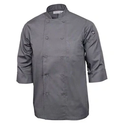 Polycotton. Grey. Double-breasted design protects the chest region from hot surfaces and cookware. Cloth-covered buttons adds to the finish. Double-breasted style allows the jacket to be reversed to hide stains.