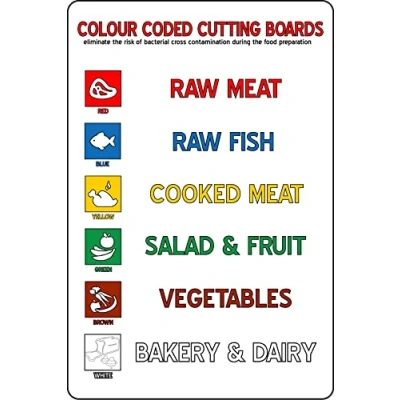 Colour coded chopping board Kitchen restaurant food hygiene safety sign 1mm Plastic sign Digitally printed for extra durability Drill and screw in position or use double sided tape to mount onto suitable surface.