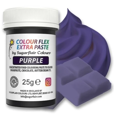 Purple Food Colouring Paste - Colour Flex Extra concentrated paste is a next generation food colouring paste developed by Sugarflair Colours and provides an unparalleled consistency and vibrancy when colouring your cakes, bakes, decorations and chocolate without changing the medium consistency and ensures bright and bold colours from just a tiny amount! Extra Concentrated Purple food colouring paste is highly concentrated so you need less of the colour to achieve the desired shade and are suitable for colouring buttercream, chocolate, ganache, sugar paste, modelling pastes, fondant, icing, cake and cookie mixes, batters and more! Colour Flex Extra is used by professionals and home bakers alike, add a little at a time using a cocktail stick to control the depth of colour. Vibrant And Versatile - Choose from black, blue, brown, golden, green, pink, purple, red, white, yellow or mix the colours together to produce a rainbow of different shades. Colour Flex Extra Paste food colouring is ideal for all types of celebration cakes, cupcakes, decorations, bakes, deserts and treats Give Your Cakes a Professional Touch - The key to the vibrant shades lies in the special formulation of the extra concentrated paste food colouring. The result is an extraordinary range of rich and intense colours that remain brilliantly vivid. Simply add the paste colour a little at a time using a cocktail stick to control the depth of colour, colours will deepen on drying or if left over night. Easy To Use - Use right from the jar, suitable for colouring buttercream, chocolate, batters, sugar paste, modelling pastes, icing, fondant and more or use as a an edible paint by adding a little rejuvenator spirit or alcohol. The extensive Sugarflair range has everything you need from food colouring paste, dust, lustre, glitter, paint, brush-on pens or edible sugars and sprinkles to give your cakes that professional touch. Nut Free, Gluten Free, GM Free, Kosher. Suitable for Vegetarians and Vegans.