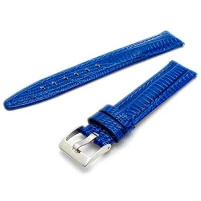 Replacement men's watch strap in blue genuine leather with a distinctive lizard grain (Not made from real lizards) Leather backed with a Chrome Finish (Silver Colour) stainless steel buckle 175mm when buckled to the last hole. Add the length of your watch to get the maximum wrist size 20mm width where the strap fixes to your watch Supplied with 20mm spring bars (watch pins) at no extra charge