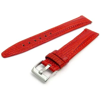 Replacement men's watch strap in Red genuine leather with a distinctive lizard grain (Not made from real lizards) Leather backed with a Chrome Finish (Silver Colour) stainless steel buckle 175mm when buckled to the last hole. Add the length of your watch to get the maximum wrist size 20mm width where the strap fixes to your watch Supplied with 20mm spring bars (watch pins) at no extra charge
