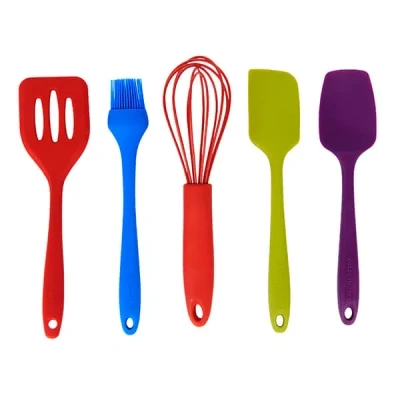 This Colourworks 5 piece mini utensils set includes a red fish slice, blue basting brush, red balloon whisk, green spatula and a purple spatula spoon.Made from food safe BPA free silicone with a tough nylon core and a high quality coating this 5 piece utensils set is ideal for small cooking and baking tasks around the kitchen.Heat resistant up to 260°C, stain and odour resistant and is also suitable for dishwasher cleaning.Complete with a manufacturers 5 year guarantee.