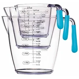 This set of three acrylic measuring jugs features coloured, shaped handles for a comfortable grip as well as displaying cup, fluid ounce, millilitre and pint measurements on the exterior, they are ideal for use when following recipes. The three sizes of measuring cups can be stacked up inside each other to save storage space in your kitchen.Capacities: 200ml, 400ml, 900mlPlease note that these jugs are not suitable for use in the microwave or with hot liquids.