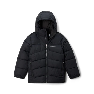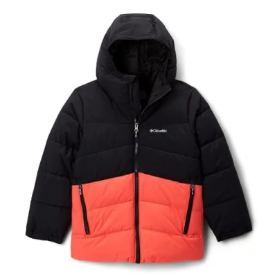 Columbia Arctic Blast™ II insulated ski jacket for kids. A lightweight, insulated jacket designed for young skiers who need reliable warmth and weather protection without restricting movement. The regular cut allows room for layering while maintaining a tidy silhouette on the slopes. The outer fabric is waterproof, providing a barrier against snow and light sleet. A fixed powder skirt helps keep snow out when skiing or playing in deep snow. The front zip features a soft chin guard to prevent rubbing and improve comfort when fully fastened. Insulation is distributed to deliver warmth where it is most needed, while the lightweight construction preserves freedom of movement. Internal lining pockets provide secure storage for small items, and an external ski pass pocket keeps lift passes accessible when required. The hood is fixed to the jacket for full coverage, with adjustable toggles to tailor the fit around the face. Elasticated stretch cuffs seal out draughts and sit neatly under gloves. Reflective detailing enhances visibility in low light conditions. Constructed from recycled polyester and durable nylon, the jacket balances performance with a degree of sustainability. Materials are chosen for their light weight and resilience, making the jacket suitable for a range of winter activities, from piste days to family snow outings. Practical features and a considered fit make the Columbia Arctic Blast II a sensible choice for children who spend time on snow. The combination of waterproof protection, integrated powder skirt, and easy-access pockets supports comfort and functionality during a ski day.