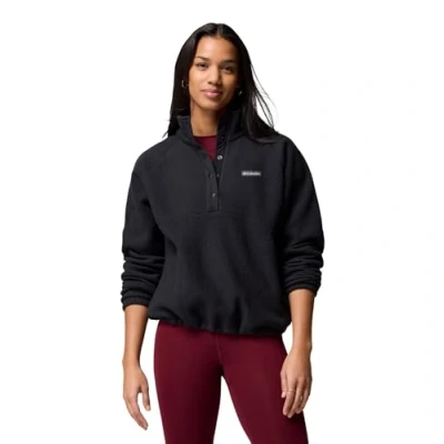 AmazonCOSY PEBBLED FLEECE: Women’s polyfleece half snap with soft texture, adjustable drawcord hem, and snap pockets for warmth ADAPTABLE & SECURE FIT: Elastic cuffs, half snap neck, and tailored women’s sizing for versatile layering and comfort HOW TO STYLE IT: Pair with jeans or leggings for work, home, or casual outings—layer up for extra winter warmth SUSTAINABLE MATERIALS & CARE: 100% recycled polyester, machine wash cold gentle, tumble dry low, do not bleach CONTENTS: 1x Columbia Jasper Ridge Pebbled Fleece Half Snap, Women's, Size: S, Colour: Black
