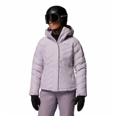 Columbia Lay D Down™ V Jacket, insulated ski jacket for women, combines packable down warmth with weather protection appropriate for resort skiing and cold-weather days. The jacket uses 550+ fill power down together with Columbia Omni-Heat reflective lining to retain body heat while keeping the overall weight low. The outer fabric is treated with Omni-Shield for water and stain resistance and is both waterproof and windproof, while breathable construction and a thermal mesh lining aid moisture management. Materials include polyester and nylon for durability and a comfortable next-to-skin feel where it matters most. Functionality is geared to active use on the hill. Underarm ventilation zips let you dump heat during high-output ascents or long runs, and a fixed, adjustable hood provides head and neck protection without compromising fit. The sleeve ski pass pocket keeps lift access simple, and stretch cuffs with thumbholes secure the sleeve and help seal out snow. Overall, the Lay D Down V Jacket balances effective down insulation with targeted ventilation and practical ski features, making it a sensible choice for women seeking reliable warmth and on-mountain functionality.